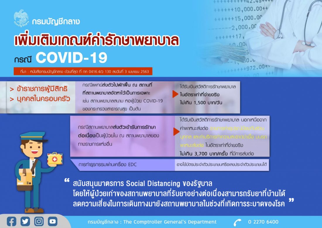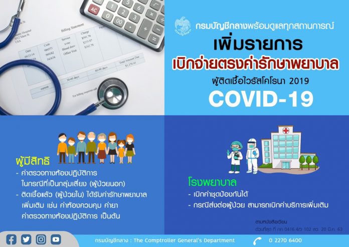 นายประภาศ คงเอียด อธิบดีกรมบัญชีกลาง เปิดเผยว่า กรมบัญชีกลางมีความห่วงใยต่อสุขภาพของข้าราชการ ลูกจ้างประจำ ผู้รับเบี้ยหวัด ผู้รับบำนาญ (ผู้มีสิทธิ) และบุคคลในครอบครัว ที่เสี่ยงหรือติดเชื้อโควิด-19 ให้สามารถเบิกค่ารักษาพยาบาลในระบบเบิกจ่ายตรงได้ โดยไม่ต้องทดรองจ่ายเงินไปก่อน โดยผู้มีสิทธิหรือบุคคลในครอบครัวที่มีอาการไข้ ไอ เจ็บคอ หอบเหนื่อย หรือมีอาการของโรคปอดอักเสบ สามารถเข้ารับการรักษาในสถานพยาบาลของทางราชการและสถานพยาบาลเอกชน
