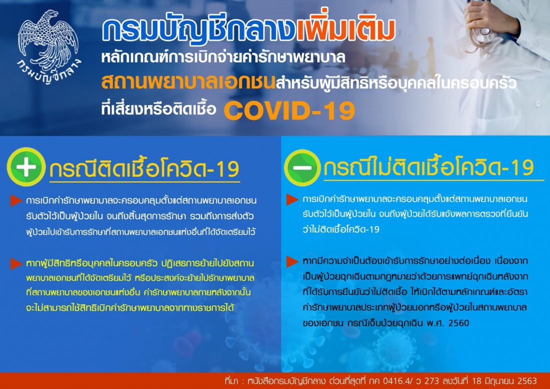 - กรณีติดเชื้อไวรัสโคโรนา 2019 (COVID – 19) และสถานพยาบาลรับตัวไว้เป็นผู้ป่วยในแล้ว สามารถเบิกค่ารักษาพยาบาลเพิ่มเติมได้ เช่น ค่าตรวจทางห้องปฏิบัติการด้วยเทคนิค Real time RT-PCR หรือเทคนิคอื่น ๆ เบิกได้เท่าที่จ่ายจริงไม่เกิน 2,200 บาทต่อครั้ง ค่าห้องพักสำหรับควบคุมหรือดูแลรักษา เบิกได้เท่าที่จ่ายจริงไม่เกิน 2,500 บาทต่อวัน ค่ายารักษาเฉพาะผู้ติดเชื้อไวรัสโคโรนา 2019 (COVID – 19) เบิกได้เท่าที่จ่ายจริงไม่เกิน 7,200 บาท