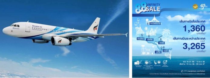 บริษัท การบินกรุงเทพ จำกัด (มหาชน) หรือ สายการบินบางกอกแอร์เวย์ส รายงานว่า ได้จัดทำโปรโมชั่น “8.8 Infinity Sale” ขายตั๋วโดยสารเครื่องราคาพิเศษ ระหว่าง 8-12 สิงหาคม 2566 แล้วให้นำไปใช้เดินทางได้ตั้งแต่วันที่ 15 กันยายน 2566 – 29 กุมภาพันธ์ 2567 ประกอบด้วยเส้นทางบิน “ในประเทศ” ราคาเริ่มต้นเที่ยวละ 1,360 บาท เช่น สมุย เชียงใหม่ ภูเก็ต ตราด กระบี่ สุโขทัย และ เส้นทางบิน “ระหว่างประเทศ” เริ่มต้นเที่ยวละ 3,265 บาทได้แก่ หลวงพระบาง สปป.ลาว ซึ่งราคาดังกล่าวรวมค่าใช้จ่ยเบ็ดเสร็จแล้วคือ ภาษีสนามบิน ค่าธรรมเนียมออกตั๋วโดยสาร และค่าธรรมเนียมเชื้อเพลิง โดยเปิดให้จองพร้อมกันทางเว็บไซต์ www.bangkokair.com/flyfest ตามเงื่อนไขเป็นไปตามที่กำหนด