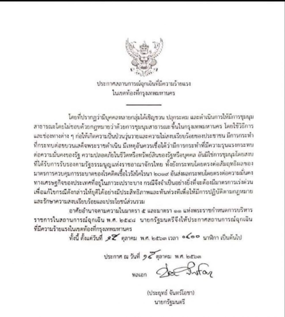 ผู้สื่อข่าวรายงานว่า เมื่อช่วงเช้ามืดของวันที่ 15 ต.ค.2563 พล.อ.ประยุทธ์ จันทร์โอชา นายกรัฐมนตรี ลงนามในประกาศสถานการณ์ฉุกเฉินที่มีความร้ายแรงในเขตท้องที่กรุงเทพมหานคร โดยมีรายละเอียดว่า