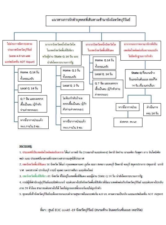 ผู้สื่อข่าวรายงานว่า ได้มีประกาศจาก คณะกรรมการควบคุมโรคติดต่อจังหวัดบุรีรัมย์ ฉบับที่ 18 ฉบับที่ 19 และ ฉบับที่ 20มีผลตั้งแต่วันเสาร์ที่ 16 พฤษภาคม 2563สรุปทำความเข้าใจ ดังนี้ ผู้ที่มาจากต่างประเทศ ต้องกักตัว อย่างน้อย 14 วัน ในสถานที่ที่กำหนด หรือเมื่อครบ 7 วันแล้วมีผลการตรวจ ว่าไม่เป็นผู้ติดเชื้อ (ออกค่าใช้จ่ายเอง)หาก State Qurantine ของรัฐบาลแล้ว มีการนำส่งมาบุรีรัมย์โดยระบบของรัฐ กักตัว 2 วัน