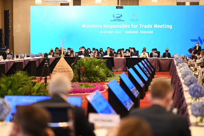 ผู้สื่อข่าวรายงานว่า วันนี้ (22 พ.ค.) ตั้งแต่เวลา 09.00 น. รัฐมนตรีการค้ากลุ่มความร่วมมือทางเศรษฐกิจภูมิภาคเอเชีย แปซิฟิก (เอเปก) ได้ประชุมรัฐมนตรีการค้า เอเปก 2022 ร่วมกันต่อเนื่องเป็นวันที่ 2 และภายหลังการประชุมเสร็จสิ้น จะมีการออกแถลงการณ์ร่วม ซึ่งเป็นผลของการประชุมครั้งนี้ โดยกำหนดเวลาแถลงข่าวผลการประชุม 11.45 น. แต่ปรากฎว่า รัฐมนตรีการค้าไม่สามารถออกแถลงการณ์ร่วมกันได้ เพราะสมาชิกบางเขตเศรษฐกิจ มีความเห็นขัดแย้งกันในบางประเด็น ที่ไม่สามารถยอมรับได้ ส่งผลให้ประเทศไทย ในฐานะประธานการประชุมครั้งนี้ จำเป็นต้องออกแถลงการณ์ของประธานแทน