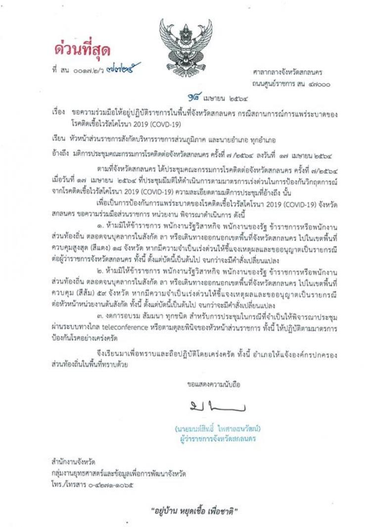 ผู้สื่อข่าวรายงานว่า เมื่อวันที่ 18 เม.ย.64 นายมนต์สิทธิ์ ไพศาลธนวัฒน์ ผู้ว่าราชการจังหวัดสกลนคร ได้ลงนามในประกาศ เรื่อง ขอความร่วมมือให้อยู่ปฏิบัติราชการในพื้นที่จังหวัดสกลนคร กรณีสถานการณ์การแพร่ระบาดของโรคติดเชื้อไวรัสโคโรนา 2019 (COVD-19)