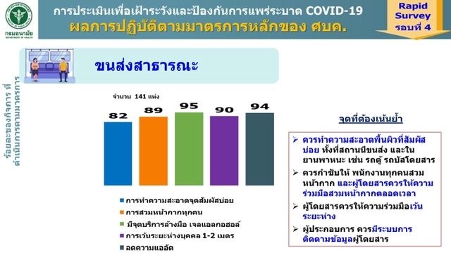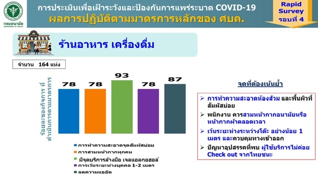 ส่วนร้านอาหาร เครื่องดื่มจำนวน 164 แห่ง ควรเพิ่มการทำความสะอาดจุดสัมผัส พนักงานควรสวมหน้ากากอนามัยหรือหน้ากากผ้าตลอดเวลา เว้นระยะห่างระหว่างโต๊ะอย่างน้อย 1 เมตร และควบคุมทางเข้าออก และดูแลให้ผู้ใช้บริการลงทะเบียนเข้า-ออกผ่านแพลตฟอร์ม “ไทยชนะ” และขนส่งสาธารณะ141 แห่ง พบว่า มีการทำความสะอาดพื้นผิวที่สัมผัสร่วมเพียงร้อยละ 82 การสวมหน้ากากทุกคนร้อยละ 89 การเว้นระยะร้อยละ 90 จึงต้องเน้นย้ำการทำความสะอาดพื้นผิวที่สัมผัสบ่อย ทั้งสถานีขนส่งและยานพาหนะ รวมถึงกำชับให้พนักงานและผู้โดยสารทุกคนเว้นระยะห่างและสวมหน้ากากตลอดเวลา