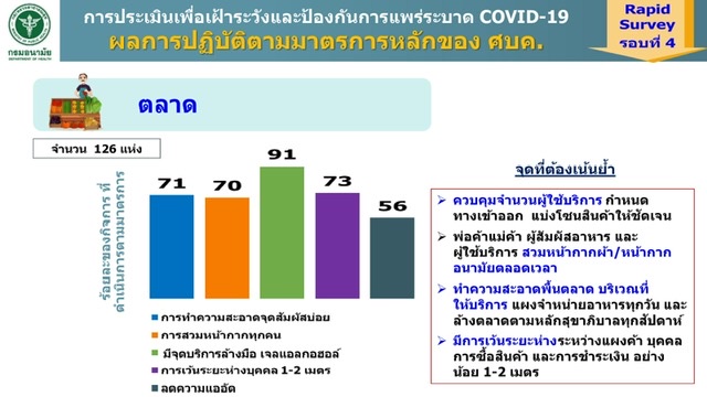 อย่างไรก็ตาม พบว่าบางกิจการมีคะแนนแต่ละด้านลดลง ควรเน้นย้ำให้ปรับปรุง โดยเฉพาะตลาด ที่สำรวจ 126 แห่งทั่วประเทศ พบว่ามีจุดบริการล้างมือเจลแอลกอฮอล์มากถึงร้อยละ 91 แต่มีผู้ใช้บริการหนาแน่น ลดความแออัดได้เพียงร้อยละ 56 การสวมหน้ากาก การทำความสะอาด การเว้นระยะห่าง อยู่ที่ประมาณร้อยละ 70 จึงต้องกำชับผู้ให้บริการควบคุมจำนวนผู้ใช้บริการ กำหนดทางเข้าออก แบ่งโซนสินค้าให้ชัดเจน ผู้ประกอบการ พ่อค้า แม่ค้า ผู้สัมผัสอาหารและผู้ใช้บริการ สวมหน้ากากผ้าหน้ากากอนามัย/หน้ากากผ้าตลอดเวลา ทำความสะอาดบริเวณที่ให้บริการตามหลักสุขาภิบาล เช่น พื้นตลาด แผงจำหน่ายอาหาร รวมถึงจัดพื้นที่ให้มีการเว้นระยะห่าง ระหว่างแผงค้า ผู้ซื้อ และการชำระเงินอย่างน้อย 1-2 เมตร