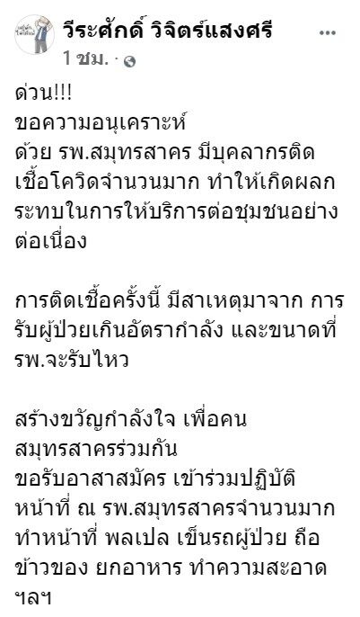 “ด่วน!!! ขอความอนุเคราะห์ ด้วย รพ.สมุทรสาคร มีบุคลากรติดเชื้อโควิดจำนวนมาก ทำให้เกิดผลกระทบในการให้บริการต่อชุมชนอย่างต่อเนื่อง