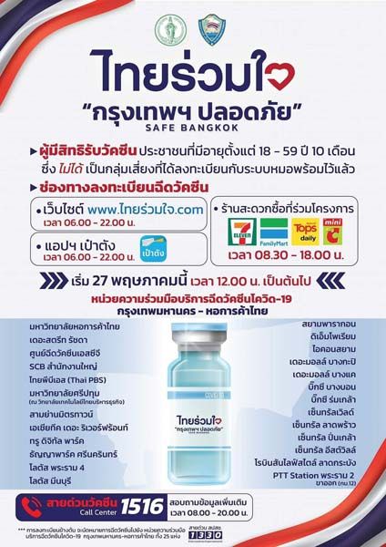วันนี้ (27 พ.ค.64) พล.ต.อ.อัศวิน ขวัญเมือง ผู้ว่าราชการกรุงเทพมหานคร เปิดเผยว่า ภายหลังเปิดให้ประชาชนพี่น้องคนกรุงเทพฯ จองรับบริการวัคซีนวันแรกผ่านโครงการ “ไทยร่วมใจ กรุงเทพฯ ปลอดภัย SAFE BANGKOK” ผ่าน 3 ช่องทางหลัก ได้แก่ เว็บไซต์ไทยร่วมใจดอทคอม แอปพลิเคชั่นเป๋าตัง และร้านสะดวกซื้อที่ร่วมโครงการ โดยมีผู้สนใจจองการฉีดวัคซีนมากกว่า 1 ล้านคน