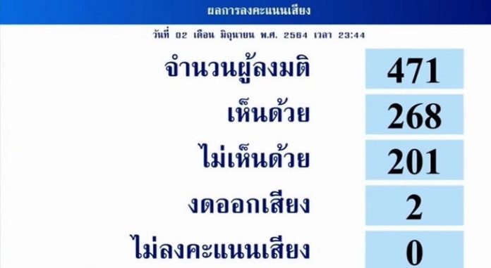 ผู้สื่อข่าวรายงานว่า เมื่อเวลา 23.45 น.ของวันที่ 2 มิ.ย.ที่ผ่านมา สภาผู้แทนราษฎร ได้ลงมติผ่านร่าง พ.ร.บ.งบประมาณรายจ่ายประจำปี พ.ศ.2565 วาระแรก  วงเงิน 3,100,000 ล้านบาท (3.1 ล้านล้านบาท) โดยมีผู้ลงมติ 471 เสียง เห็นชอบ 268 เสียง ไม่เห็นด้วย 201 เสียง งดออกเสียง 2 เสียง โดยหลังจากนี้เข้าสู่กระบวนการพิจารณาของคณะกรรมาธิการงบประมาณ