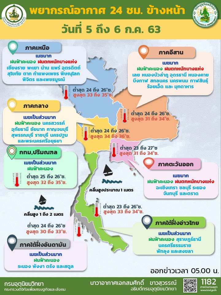 กรมอุตุนิยมวิทยา ได้พยากรณ์อากาศ 24 ชั่วโมงข้างหน้าตั้งแต่เวลา 06:00 วันนี้(5ก.ค.) ถึง 06:00 วันพรุ่งนี้(6ก.ค.) มรสุมตะวันตกเฉียงใต้ที่พัดปกคลุมทะเลอันดามันและประเทศไทยมีกำลังค่อนข้างแรง ลักษณะเช่นนี้ทำให้บริเวณภาคเหนือ ภาคตะวันออกเฉียงเหนือ และภาคตะวันออก มีฝนตกหนักบางแห่ง ขอให้ประชาชนที่อาศัยในพื้นที่เสี่ยงภัยบริเวณดังกล่าวระมัดระวังอันตรายจากฝนที่ตกหนักและฝนที่ตกสะสมไว้ด้วย