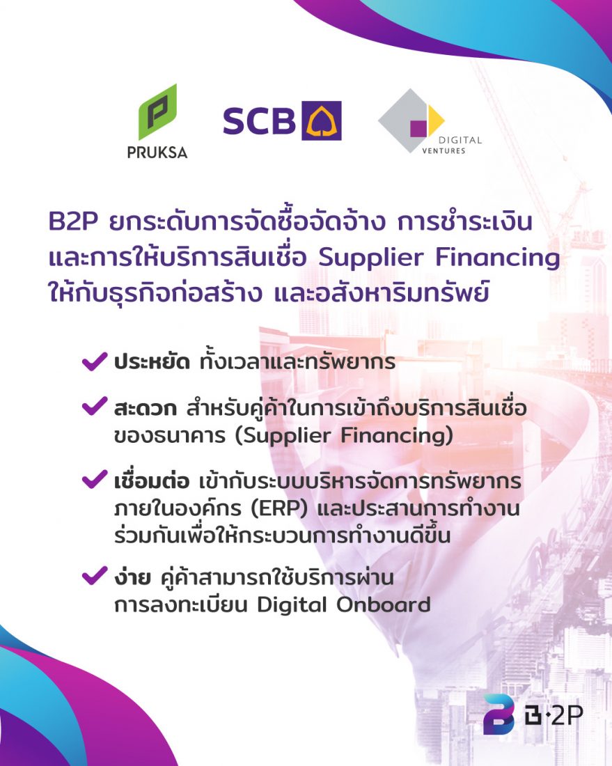 ด้านนายอรพงศ์ เทียนเงิน ประธานเจ้าหน้าที่บริหาร บริษัท ดิจิทัล เวนเจอร์ส จำกัด กล่าวว่า การพัฒนาแพลตฟอร์มB2P ครั้งนี้ตั้งเป้าหมายที่จะเป็นทางเลือกในการเพิ่มประสิทธิภาพให้กับอุตสาหกรรมรับเหมาก่อสร้าง และอสังหาริมทรัพย์ของประเทศไทยทั้งระบบ โดยศึกษาปัญหาจากธุรกิจจริงและได้พัฒนาต่อยอดให้ระบบจัดซื้อจัดจ้างและการชำระเงินของแพลตฟอร์มสามารถรองรับกระบวนการจัดซื้อจัดจ้างและการชำระเงินรวมถึงการให้คู่ค้าสามารถขอสินเชื่อจากธนาคาร (Supplier Financing) ผ่านทางแพลตฟอร์ม เพื่อเสริมสภาพคล่องทางการเงินได้อย่างสะดวกยิ่งขึ้น บริการของ B2P สามารถตอบโจทย์คู่ค้าในงานรับเหมาทุกรูปแบบ ครอบคลุมซัพพลายเชนทั้งที่เป็นนิติบุคคล และบุคคลธรรมดาที่มีส่วนเกี่ยวข้องกับโครงการ เช่น งานซื้อขายวัสดุก่อสร้างทั่วไป งานรับเหมาก่อสร้าง งานรับเหมาช่วงงานออกแบบตกแต่งภายใน ตลอดจนงานบริการต่าง ๆ เป็นต้น