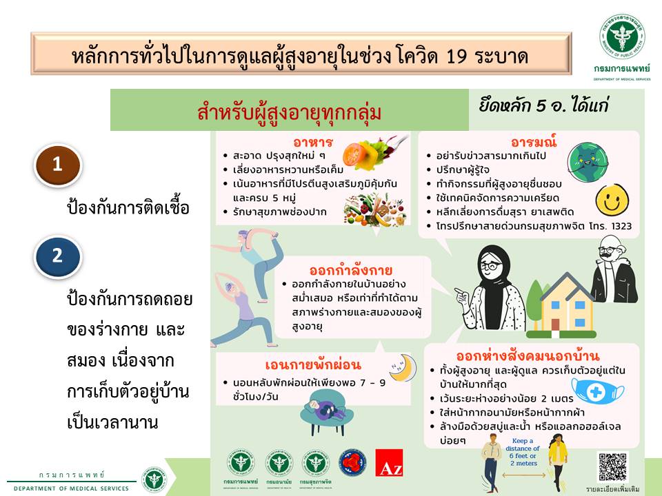 นายแพทย์สมศักดิ์ อรรฆศิลป์ อธิบดีกรมการแพทย์ เปิดเผยว่า จากรายงานผู้ติดโรคโควิด19 พบว่าผู้สูงอายุส่วนใหญ่ติดเชื้อมาจากคนใกล้ชิด ที่สำคัญคือกลุ่มที่มีอายุมากกว่า 70 ปี หากติดเชื้อจะมีโอกาสเสียชีวิตสูงกว่ากลุ่มอื่น เนื่องจากสภาพร่างกายไม่แข็งแรง และมีโรคประจำตัว เช่น โรคเบาหวาน โรคความดันโลหิตสูงที่ควบคุมไม่ดี หรือโรคเรื้อรังอื่น ๆ ผู้สูงอายุจึงไม่ควรออกจากบ้าน นอกจากนี้ยังพบว่าผู้สูงอายุติดเชื้ออาจแสดงอาการไม่ตรงไปตรงมา อาจไม่มีไข้ ตัวไม่ร้อน ไอไม่ชัด บอกไม่ได้ว่าเจ็บคอ จึงต้องสังเกตอาการอื่นด้วย เช่น หายใจเร็ว หอบ อ่อนเพลีย เบื่ออาหาร รับอาหารทางสายยางไม่ได้ ซึมสับสนเฉียบพลัน หรือความสามารถในการช่วยเหลือตัวเองลดลงอย่างรวดเร็ว หากพบอาการดังกล่าวควรรีบปรึกษาแพทย์ โรงพยาบาลที่ดูแลประจำ สายด่วนกรมการแพทย์ 1668 หรือสายด่วนศูนย์นเรนทร 1669