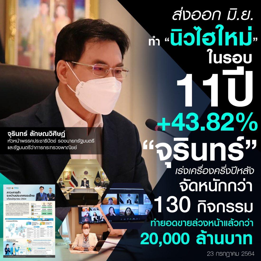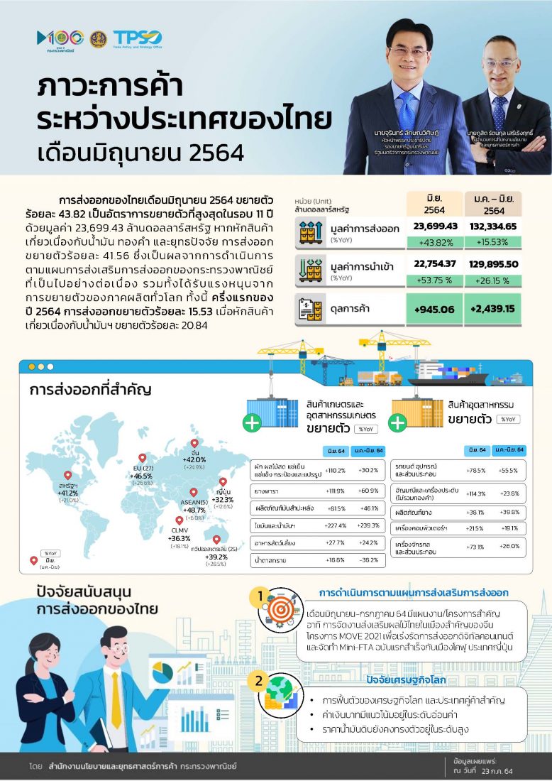 นายจุรินทร์ ลักษณวิศิษฏ์ รองนายกรัฐมนตรี และรมว.พาณิชย์ เปิดเผยถึงภาวะการค้าระหว่างประเทศของไทยว่า เดือนมิ.ย.64 การส่งออกมีมูลค่า 23,699.43 ล้านเหรียญสหรัฐฯ เพิ่มขึ้น 43.82% เมื่อเทียบกับเดือนมิ.ย.63 ขยายตัวสูงสุดในรอบ 11 ปี 1 เดือน ส่วนการนำเข้ามูลค่า  22,754.4 ล้านเหรียญฯ เพิ่มขึ้น 53.75% ดุลการค้าเกินดุล  945.1 ล้านเหรียญฯ ขณะที่ช่วง 6 เดือน (ม.ค.-มิ.ย.) ปีนี้ การส่งออกมีมูลค่า 132,334.6 ล้านเหรียญฯ เพิ่มขึ้น 15.53% เทียบกับช่วงเดียวกันของปี 63 การนำเข้า 129,895.5 ล้านเหรียญฯ เพิ่มขึ้น 26.15% เกินดุล 2,439.2 ล้านเหรียญฯ