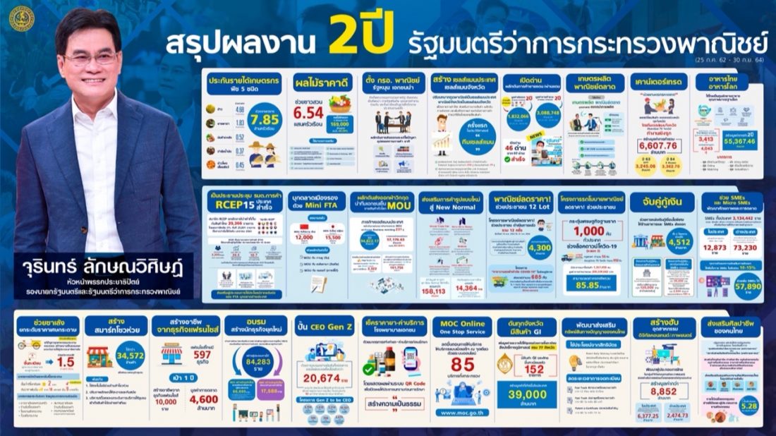 นางมัลลิกา บุญมีตระกูล มหาสุข ที่ปรึกษารมว.พาณิชย์ เปิดเผยระหว่างแถลงผลงานกระทรวงพาณิชย์ในรอบ 2 ปีภายใต้การนำของนายจุรินทร์ ลักษณวิศิษฏ์ รองนายกรัฐมนตรี และรมว.พาณิชย์ว่า มีผลงานเด่นทั้งหมด 27 ด้าน โดยผลงานที่สำคัญ คือ ประกันรายได้เกษตรกรผู้ปลูกพืชหลัก 5 ชนิด ได้แก่ ข้าวเปลือก ข้าวโพดเลี้ยงสัตว์ ปาล์มน้ำมันมันสำปะหลัง และยางพารา ซึ่งสามารถช่วยเหลือเกษตรกรทั้งสิ้น 7.8 ล้านครัวเรือน และเงินตกถึงมือเกษตรกรทุกบาททุกสตางค์ ช่วยขับเคลื่อนเศรษฐกิจฐานรากในภาวะวิกฤตโควิด-19