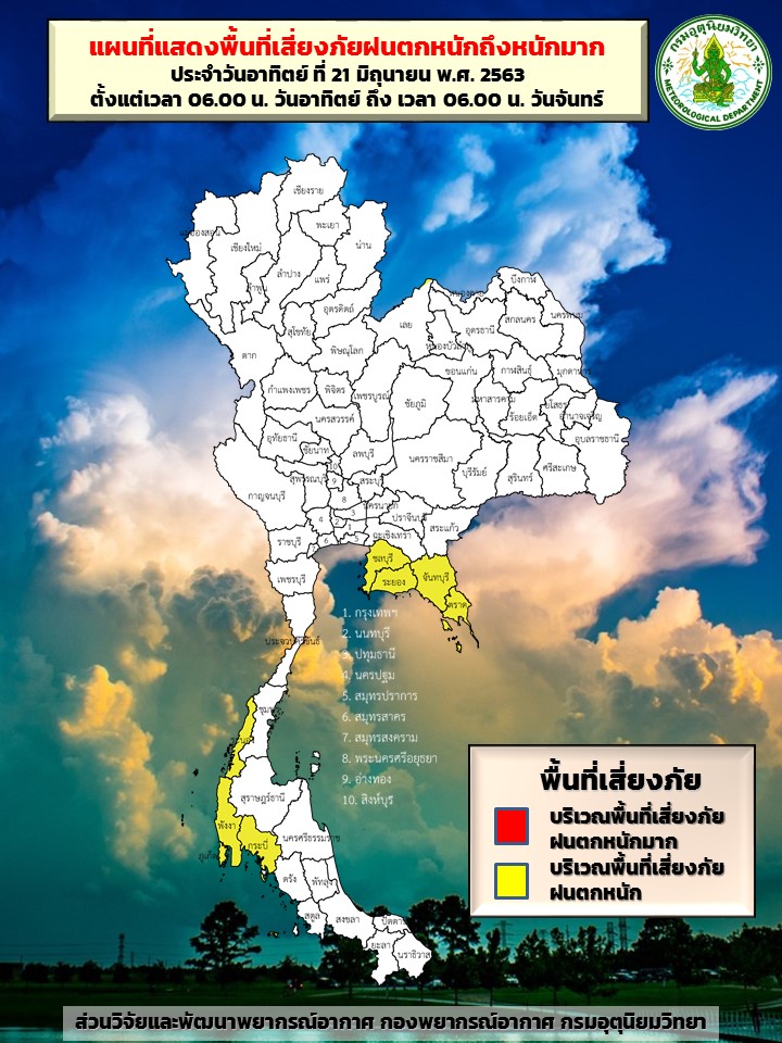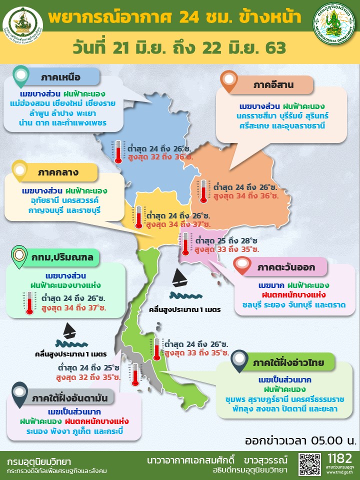 กรมอุตุนิยมวิทยา ได้พยากรณ์อากาศ 24 ชั่วโมงข้างหน้า ตั้งแต่เวลา 06:00 วันนี้ (21 มิ.ย.) ถึง 06:00 วันพรุ่งนี้(22 มิ.ย.). บริเวณประเทศไทยมีฝนลดลง เนื่องจากมรสุมตะวันตกเฉียงใต้ที่พัดปกคลุมทะเลอันดามันและประเทศไทยมีกำลังอ่อนลง แต่ยังคงทำให้ภาคตะวันออก และภาคใต้ฝั่งตะวันตก ซึ่งเป็นด้านรับลมมรสุมมีฝนตกหนักบางแห่ง ขอให้ประชาชนบริเวณพื้นที่เสี่ยงภัยในบริเวณดังกล่าว ระวังอันตรายจากฝนตกหนักและฝนที่ตกสะสมในระยะนี้