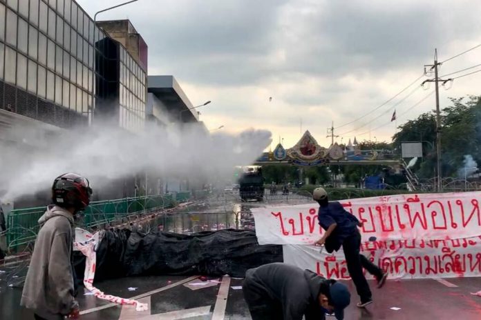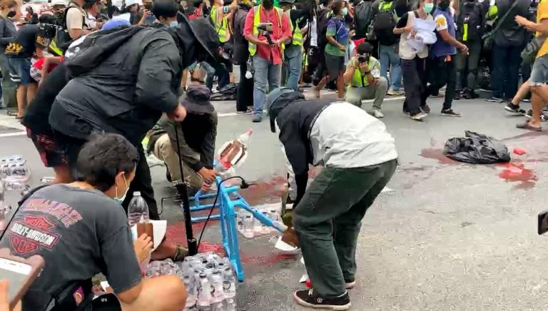 ต่อมาเวลา 16.30 น.มวลชนได้เริ่มเข้าพื้นที่ โดยมีการฉีดสเปรย์ลงบนพื้นถนนและเขียนข้อความบนป้ายผ้า โจมตีการทำงานของ พล.อ.ประยุทธ์ ขณะเดียวกันเตรียมจรวดขวดน้ำผสมสีเพื่อมาตอบโต้กับเจ้าหน้า เหมือนวันที่ 25 ก.ย.ที่ผ่านมา