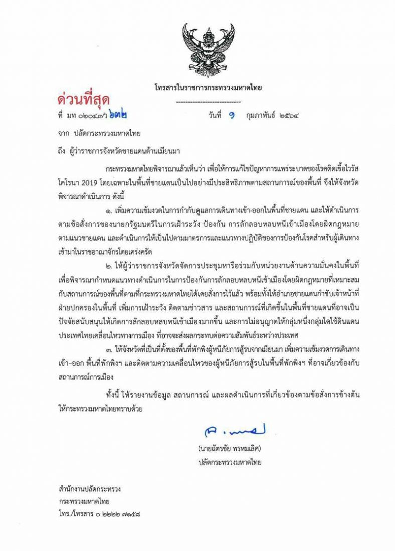 นายฉัตรชัย พรหมเลิศ ปลัดกระทรวงมหาดไทย ได้ส่งหนังสือถึงผู้ว่าราชการจังหวัดชายแดนด้านเมียนมา ลงวันที่1ก.พ.ที่ผ่านมา โดยมีเนื้อหาระบุว่า กระทรวงมหาดไทยพิจารณาแล้วเห็นว่า เพื่อให้การแก้ไขปัญหาการแพร่ระบาดของโรคติดเชื้อไวรัสโคโรนา 2019 โดยเฉพาะในพื้นที่ชายแดนเป็นไปอย่างมีประสิทธิภาพตามสถานการณ์ของพื้นที่ จึงให้จังหวัด พิจารณาดำเนินการ ดังนี้ 1.เพิ่มความเข้มงวดในการกำกับดูแลการเดินทางเข้า-ออกในพื้นที่ชายแดน และให้ดำเนินการ ตามข้อสั่งการของนายกรัฐมนตรีในการเฝ้าระวัง ป้องกัน การลักลอบหลบหนีเข้าเมืองโดยผิดกฎหมายตามแนวชายแดน และดำเนินการให้เป็นไปตามมาตรการและแนวทางปฏิบัติของการป้องกันโรคสำหรับผู้เดินทางเข้ามาในราชอาณาจักรโดยเคร่งครัด
