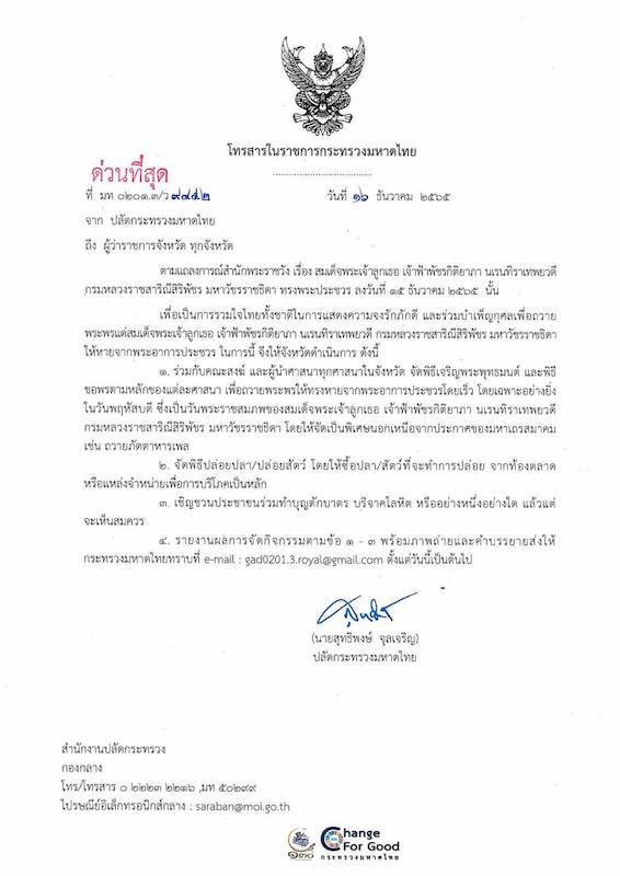 นายสุทธิพงษ์ จุลเจริญ ปลัดกระทรวงมหาดไทย เปิดเผยวานนี้(17ธ.ค.) ว่า ตามที่พี่น้องประชาชนคนไทยทุกคนได้รับทราบแถลงการณ์สำนักพระราชวัง เรื่อง สมเด็จพระเจ้าลูกเธอ เจ้าฟ้าพัชรกิติยาภา นเรนทิราเทพยวดี กรมหลวงราชสาริณีสิริพัชร มหาวัชรราชธิดา ทรงพระประชวร ลงวันที่ 15 ธันวาคม 2565 ซึ่งพี่น้องประชาชนในทั่วทุกภูมิภาคต่างมีความห่วงใยและปรารถนาในการร่วมกันถวายพระพรให้พระองค์ทรงหายจากพระอาการประชวรในเร็ววัน