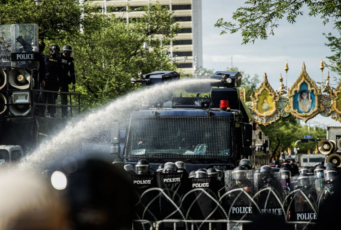 ทางด้านม็อบขอให้เจ้าหน้าที่เปิดทางเพื่อให้มวลชนเคลื่อนต่อไปยังจุดหมาย มีการฉีดน้ำในช่วงสั้นๆ หลังจากทีมวลชนพยายามจะเข้าใกล้แนวกั้น และขอให้มวลชนรับฟังพร้อมเดินทางแยกย้ายกลับ ประกาศครั้งสุดท้ายว่าจะยกระดับในจุดนี้หากมวลชนไม่ถอยออกไป รถจีโน่ฉีดน้ำเป็นระยะไปในทางที่มีการพยายามจะรื้อรั้วลวดหนาม รวมถึงมีเสียงคล้ายการยิงกระสุนยางเป็นระยะ สั่งรถจีโน่ผสมแก๊สใส่เฉพาะกลุ่มคนที่รื้อสิ่งกีดขวาง แต่ไม่ดำเนินการใดๆ กับผู้นุมนุมที่นั่งด้วยความสันติ