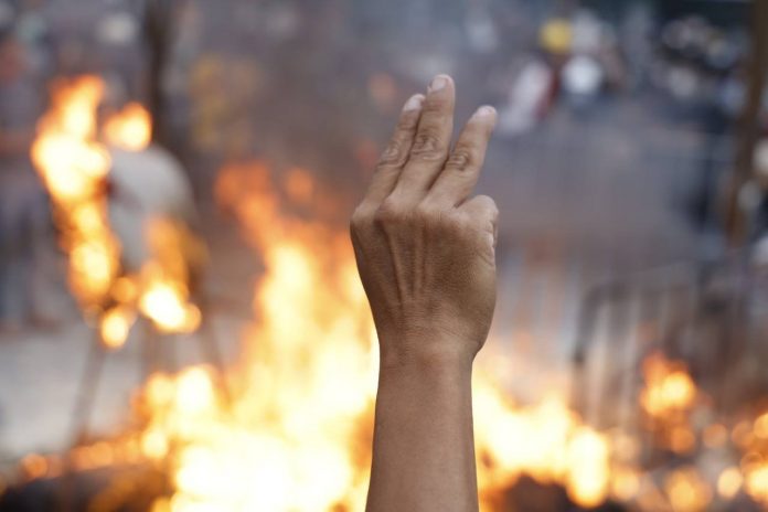 เวลา 18.15 น. ประชาชนยืนชู 3 นิ้ว พร้อมร้องเพลง Do you hear the people’s sing ? โดยสายตาเพ่งมองไปที่กองเพลิง