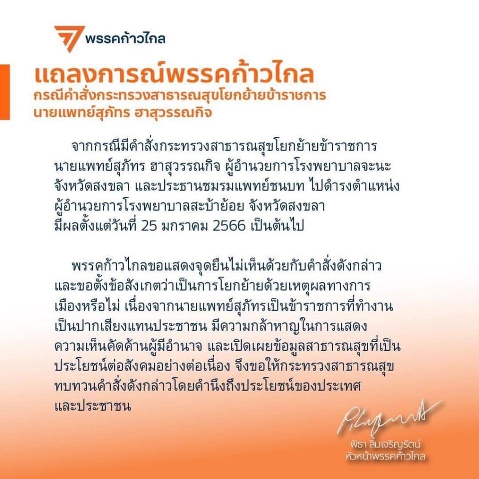 ล่าสุด พรรคก้าวไกลออกแถลงการณ์คัดค้านการย้ายแพทย์สุภัทร ฮาสุวรรณกิจ ผู้อำนวยการโรงพยาบาลจะนะ และประธานชมรมแพทย์ชนบท ไปดำรงตำแหน่งผู้อำนวยการโรงพยาบาลสะบ้าย้อย จังหวัดสงขลา มีผลตั้งแต่วันที่ 25 มกราคม 2566 เป็นต้นไป โดยตั้งข้อสงสัยว่าเป็นการย้าย ที่มีเรื่องของ “การเมือง” แอบแฝง และลงชื่อหัวหน้าพรรคคุณพิธา ว่ารับทราบกับแถลงการณ์ฉบับนี้