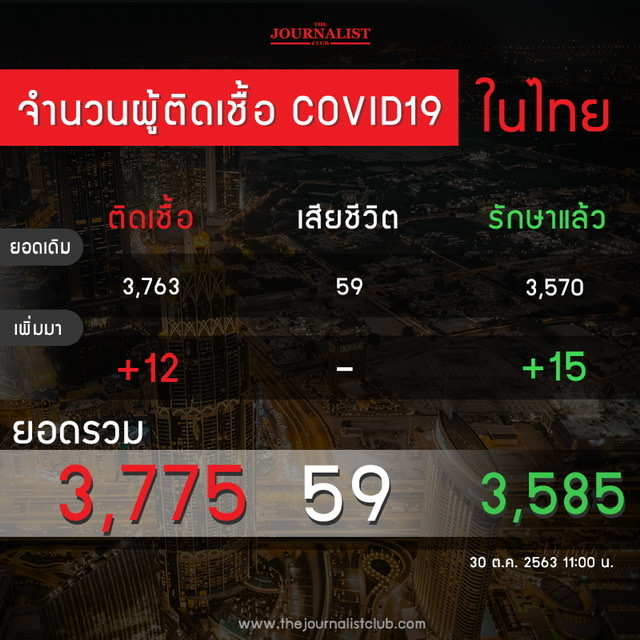 ผู้สื่อข่าวรายงานว่า ศูนย์บริหารสถานการณ์การแพร่ระบาดของโรคติดเชื้อไวรัสโคโรนา 2019 (โควิด-19) หรือ ศบค. ได้แถลงสถานการณ์โควิด-19 ในประเทศไทย ประจำวันที่ 30 ต.ค. 2563 ว่า สถานการณ์การแพร่ระบาดโควิด-19 วันนี้พบผู้ติดเชื้อรายใหม่เพิ่ม 12 ราย โดยยอดผู้ป่วยสะสมอยู่ที่ 3,775 ราย ไม่มีผู้เสียชีวิตรายใหม่เพิ่ม ยอดผู้เสียชีวิตสะสมทั่วประเทศอยู่ที่ 59 ราย โดยวันนี้มียอดผู้ติดเชื้อรักษาหายเพิ่ม 15 ราย ทำให้ยอดรวมผู้ป่วยรักษาตัวหายกลับบ้านอยู่ที่ 3,585 ราย