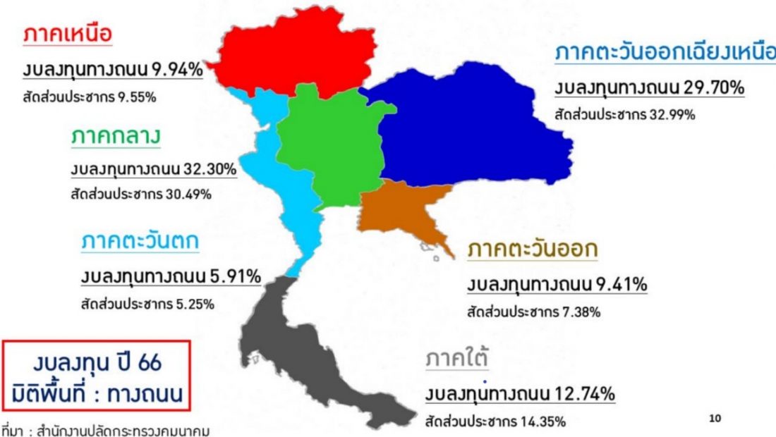 1. การกระจายตัวของงบประมาณ ของกระทรวงคมนาคมประจำปี 2566 พบว่างบประมาณภาพรวมในทุกมิติของรูปแบบการคมนาคมขนส่งทั้งถนน ราง น้ำ อากาศ ได้รับจัดสรรลงในพื้นที่ มีการกระจายตัวครอบคลุมทุกภูมิภาคของประเทศ เช่น ด้านการขนส่งทางถนน การกระจายตัวของงบประมาณสอดคล้องกับการกระจายตัวของประชากรในแต่ละภูมิภาค โดยภาคกลางมีการจัดสรรงบประมาณสูงสุด ประมาณ 32.3% เนื่องจาก ภาคกลางมีประชากรอยู่ประมาณ  30% ของทั้งประเทศ ส่วนภาคเหนือมีการจัดสรรงบประมาณเพียง  9.94 %ของทั้งประเทศ เพราะมีประชากร  9.55 %ของประเทศ เป็นต้น แสดงให้เห็นว่าการจัดสรรงบประมาณของกระทรวงคมนาคมสอดคล้องกับความจำเป็นที่ต้องใช้ และความต้องการของประชาชนในแต่ละพื้นที่อย่างแท้จริง