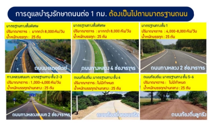 3. การบริหารจัดการถนนระหว่างส่วนกลางกับท้องถิ่น โครงข่ายถนนในประเทศไทยกว่า 700,000 กว่ากิโลเมตร อยู่ในความรับผิดชอบของกระทรวงคมนาคม ประมาณ 100,000 กิโลเมตร โดยมีหน่วยงานรับผิดชอบ คือ กรมทางหลวง กรมทางหลวงชนบท และการทางพิเศษแห่งประเทศไทย และอีกกว่า 600,000 กิโลเมตรนั้น อยู่ในความรับผิดชอบของกระทรวงมหาดไทย โดยกรุงเทพมหานคร และองค์กรปกครองส่วนท้องถิ่น ซึ่งในส่วนของกระทรวงคมนาคมได้พิจารณาจัดสรรงบประมาณตามมาตรฐานของถนนแต่ละประเภท โดยขึ้นอยู่กับปริมาณจราจร และการรับน้ำหนักบรรทุก ซึ่งถนนมาตรฐานสูง เช่น มอเตอร์เวย์ ทางหลวง  4 ช่องจราจร ก็จะใช้งบประมาณในการซ่อมบำรุงที่สูงกว่า เมื่อเทียบกับถนนท้องถิ่นที่เป็นถนนลูกรังที่ใช้งบประมาณที่น้อยกว่า จึงจะเห็นได้ว่ามาตรฐานชั้นทางที่ต่างกันการรับปริมาณจราจร และปริมาณรถบรรทุกก็ต่างกัน ทำให้งบประมาณในการซ่อมบำรุงต่อกิโลเมตร จึงแตกต่างกันตามประเภทของถนน