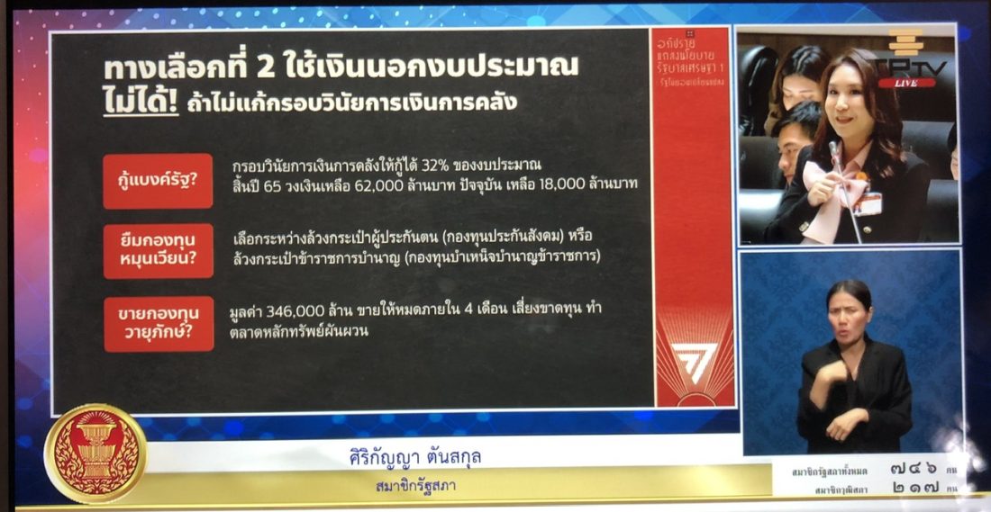 ด้านทางเลือกที่ 2 ใช้เงินนอกงบประมาณ ซึ่งก็จะทำไม่ได้หากไม่แก้กรอบวินัยการเงินการคลัง ขายกองทุนวายุภักษ์ดีไหม เงิน 346,000 ล้านบาท ขายให้หมดภายใน 4 เดือน ก็เสี่ยงขาดทุนได้ ตลาดหลักทรัพย์ผันผวนได้ ก็ต้องปรึกษานักลงทุนในตลาดหลักทรัพย์ดูว่าจะเอาด้วยหรือไม่ และหากเลือกเงินกองทุนหมุนเวียน ก็มี 2 กองทุน ที่จะให้ยืมได้คือล้วงกระเป๋าผู้ประกันตน กองทุนประกันสังคม หรือล้วงกระเป๋าข้าราชการบำนาญ กองทุนบำเหน็ดบำนาญข้าราชการจุดนี้ต้องขอแบรนด์ เพราะมองว่าไม่ใช่เงินของรัฐบาล 100% เป็นเงินสมทบของผู้ประกันตน และข้าราชการ ไม่ควรที่จะต่องถูกนำมาใช้แบบนี้แน่นอน และทางเลือกสุดท้ายคือ กู้แบงก์รัฐ ซึ่งกรอบวินัยการเงินการคลังให้กู้ได้ 32% ของงบปะมาณรายจ่ายประจำปี ซึ่งตอนนี้ก็จ่อถึงคอหอยแล้ว โดย  สิ้นปี 65 วงเงินเหลือ 62,000 ล้านบาท ปัจจุบันคาดเหลือ 18,000 ล้านบาท คิดว่าคงไม่สง่างามเท่าไร สำหรับการดำเนินนโยบายการเงินการคลังในรูปแบบดังกล่าว
