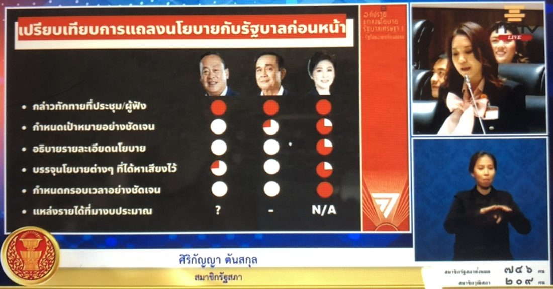 ทั้งนี้ หากมาเจาะถึงนโยบายที่ใช้ตอนหาเสียง กับการแถลงนโยบายในวันนี้ ..ศิริกัญญา กล่าวว่า ในด้านนโยบายพักหนี้เกษตรกร 3 ปี รายได้ดี 3 เท่า แต่ตอนมาอยู่ในแถลงนโยบายจริงบอกเป็นพักหนี้ตามความเหมาะสมรายได้เพิ่มขึ้นอย่างมีนัยสำคัญ ประเด็นค่าแรงขั้นต่ำ 600 บาทต่อวัน จบปริญญาตรีรับ 25,000 บาทต่อเดือน มาตอนนี้บอกเพียงให้ค่าแรงขั้นต่ำและเงินเดือนที่เป็นธรรมแทน เร่งรัดออกโฉนดที่ดินทำกิน 50 ล้านไร่ แต่ในเอกสารบอกเพียงเร่งดำเนินการให้ประชาชนมีสิทธิในที่ดิน จะปฏิรูประบบราชการโดยรัฐบาลดิจิทัล แต่ในเอกสารบอกแค่ปรับปรุงการทำงานของภาครัฐให้เป็นรัฐบาลดิจิทัล