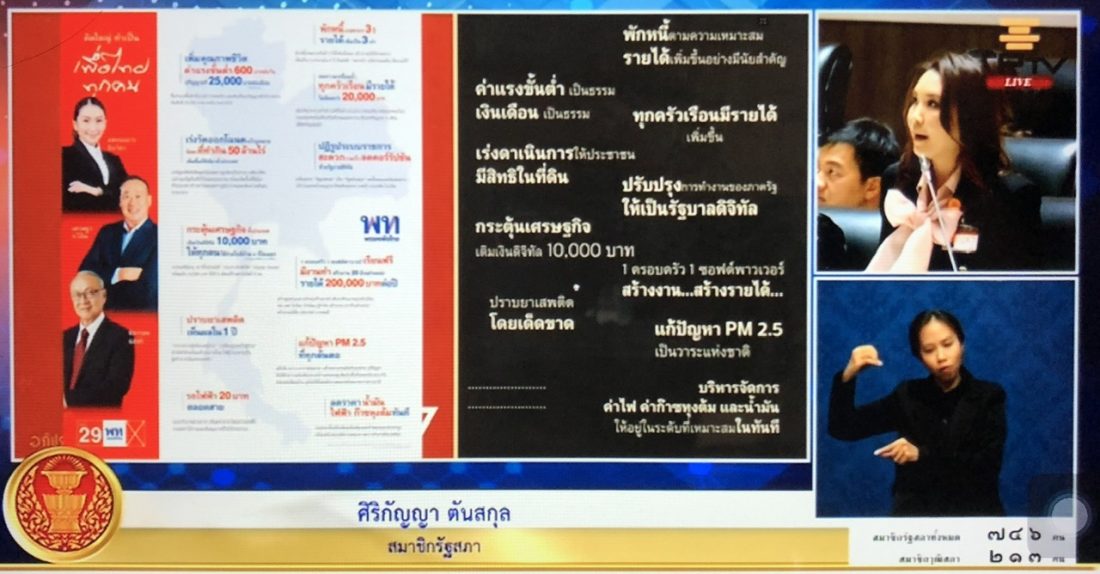 แผนกระตุ้นเศรษฐกิจโดยเติมเงิน 10,000 บาท ในกระเป๋าตังค์ดิจิทัล แต่ไม่ได้บอกว่าให้ทุกคนเหมือนเดิม หนึ่งครอบครัวหนึ่งซอฟเพาเวอร์ มีงานทำ 20 ล้านตำแหน่ง รายได้ 200,000 บาทต่อปี แต่วันนี้เลยแค่หนึ่งครอบครัวหนึ่งซอฟเพาเวอร์ สร้างงานสร้างรายได้ไม่บอกจำนวนตำแหน่งและรายได้แล้ว ปราบยาเสพติดเห็นผลใน 1 ปี วันนี้เลยแค่ปราบยาเสพติดโดยเด็ดขาด และประเด็นรถไฟฟ้า 20 บาทตลอดสายนี้คือหายไปไม่มี นโยบายลดค่าไฟ ก๊าซ น้ำมันก็เลยแค่การบริหารจัดการให้อยู่ในระดับที่เหมาะสมในทันที ในจุดนี้ถือเป็นการทวงคำสัญญาเพียงเบาๆ ก่อน เพราะเดี๋ยวทางสมาชิกพรรคเองต้องมาทวงในแบบเจาะลึกกันอีกครั้งแน่นอน