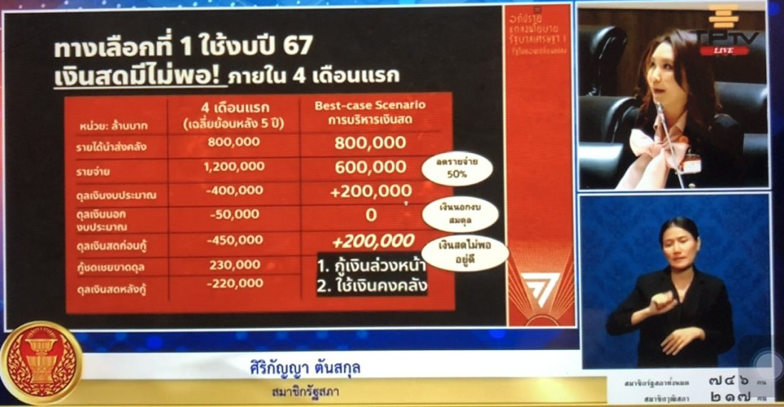 ส่วนหากใช้เงินสด ดุลเงินสดงบประมาณรายจ่ายประจำปี จะพบ 4 เดือนแรกใีาายได้นำส่งคลังเฉลี่ยอยู่ที่ 800,000 ล้านบาท แต่รายได้มีถึง 1.2 ล้านล้านบาท ซึ่งก็จะติดลบดุลเงินสดอยู่ 400,000 ล้านบาท
