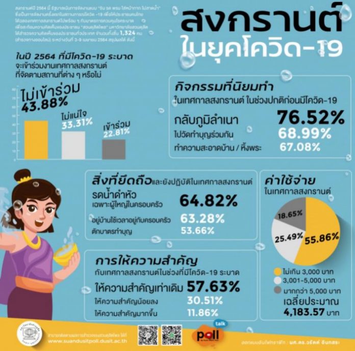 วันที่ 11 เม.ย.2564 สวนดุสิตโพล มหาวิทยาลัยสวนดุสิต สำรวจความคิดเห็นของประชาชนต่อกรณี “สงกรานต์ในยุคโควิด-19” กลุ่มตัวอย่างจำนวน 1,324 คน สำรวจวันที่ 3 – 9 เมษายน 2564 พบว่า ในปีนี้ที่มีโควิด-19 ระบาด ประชาชนจะไม่เข้าร่วมงานเทศกาลสงกรานต์ ร้อยละ 43.88 กิจกรรมที่นิยมทำก่อนมีโควิด-19 คือ กลับภูมิลำเนา ร้อยละ 76.52 สิ่งที่ยึดถือปฏิบัติแม้จะมีโควิด-19 คือ การรดน้ำดำหัวผู้ใหญ่ในครอบครัว ร้อยละ 64.82 ค่าใช้จ่ายในช่วงสงกรานต์ปีนี้คาดว่าจะใช้จ่ายเฉลี่ยประมาณ 4,183 บาท และในช่วงที่มีโควิด-19 ระบาดประชาชนก็ยังให้ความสำคัญกับเทศกาลสงกรานต์เหมือนเดิม ร้อยละ 57.63