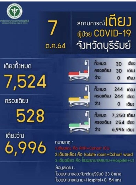 ขณะเดียวกัน สถานการณ์เตียง ผู้ป่วยโควิด-19 จังหวัดบุรีรัมย์ เตียงทั้งหมด 7,524 เตียง ครองเตียง 528 เตียง เหลือเตียงว่าง 6,996 เตียง แยกเป็น ผู้ป่วยสีแดง ทั้งหมด 30 เตียง ครองเตียง 30 เตียง ไม่มีเตียงว่าง ผู้ป่วยสีเหลืองทั้งหมด 244 เตียง ครองเตียง 244 เตียง ไม่มีเตียงว่าง และผู้ป่วยสีเขียว ทั้งหมด 7,250 เตียง ครองเตียง 254 เตียงเหลือเตียงว่าง 6,996 เตียง