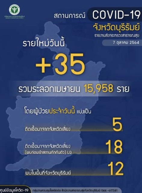 ผู้สื่อข่าวรายงานว่า วันนี้ (8 ต.ค.64) ศูนย์ปฏิบัติการตอบโต้ภาวะฉุกเฉิน สำนักงานสาธารณสุข จังหวัดบุรีรัมย์ ได้รายงานข้อมูลสถานการณ์แพร่ระบาดของโรคติดเชื้อไวรัสโคโรนา หรือโควิด-19 ระลอกใหม่ ตั้งแต่วันที่ 1 เม.ย.2564 ถึง วันที่ 7 ต.ค.2564 ของ จ.บุรีรัมย์ ว่าวันนี้พบผู้ป่วยยืนยันติดเชื้อโควิด-19 รายใหม่ จำนวน 35 ราย โดยเป็นผู้ป่วยติดเชื้อพบในพื้นที่จังหวัด 12 ราย ติดเชื้อมาจากนอกพื้นที่ 23 ราย แยกเป็นติดเชื้อมาจากจังหวัดเสี่ยง 5 ราย และติดเชื้อมาจากจังหวัดเสี่ยง (พบก่อนเข้าสถานกักกันตัว) LQ 18 ราย รวมยอดผู้ป่วยสะสม 15,958 ราย เสียชีวิตสะสม 73 ราย หายป่วยสะสม 15,366 ราย ยังรักษาอยู่ 519 ราย กระจายตามโรงพยาบาลต่างๆ ในพื้นที่จังหวัด