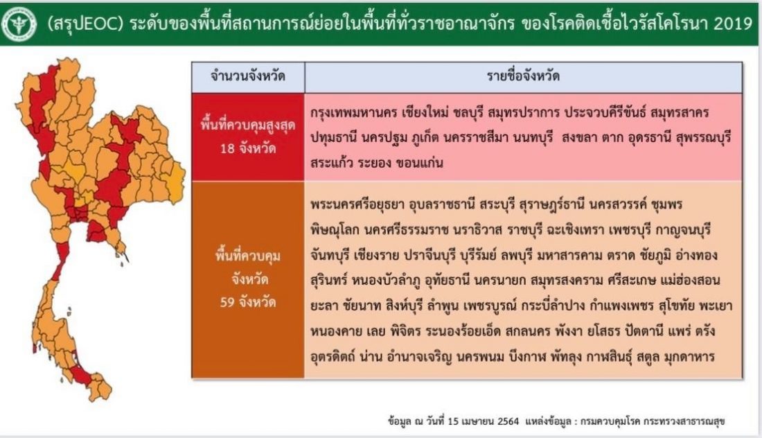 ถึงมาตรการที่เตรียมเสนอต่อที่ประชุม ศบค.ชุดใหญ่ ในวันพรุ่งนี้ (16เม.ย.) หลังสถานการณ์ โควิด-19 มียอดผู้ป่วยสูงขึ้นจนถึงหลักพันต่อวันในช่วงเทศกาลสงกรานต์ ว่าที่ประชุมมีมติเสนอมาตรการเพิ่มพื้นที่จังหวัดควบคุมสูงสุดเป็นสีแดง 18 จังหวัด และพื้นที่ควบคุมสีส้ม 59 จังหวัด