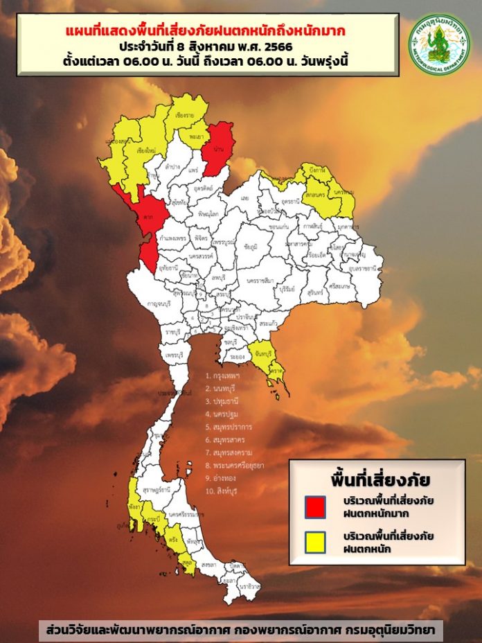 สภาพอากาศ 24 ชั่วโมงข้างหน้ากรมอุตุนิยมวิทยาพยากรณ์อากาศตั้งแต่เวลา06:00 น. วันนี้(8ส.ค.) ถึง 06:00 น. วันพรุ่งนี้(9ส.ค.) มรสุมตะวันตกเฉียงใต้กำลังปานกลางพัดปกคลุมทะเลอันดามัน ประเทศไทย และอ่าวไทย ประกอบกับมีหย่อมความกดอากาศต่ำปกคลุมบริเวณประเทศเวียดนามตอนบนและประเทศจีนตอนใต้