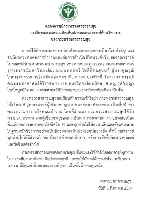 กระทรวงสาธารณสุข ขอเรียนทำความเข้าใจว่า กระทรวงฯ ได้เรียนเชิญคณาจารย์ผู้เชี่ยวชาญ จากหลากหลายสถาบัน มาช่วยเป็นที่ปรึกษา เป็นคณะกรรมการ หรือคณะทำงาน