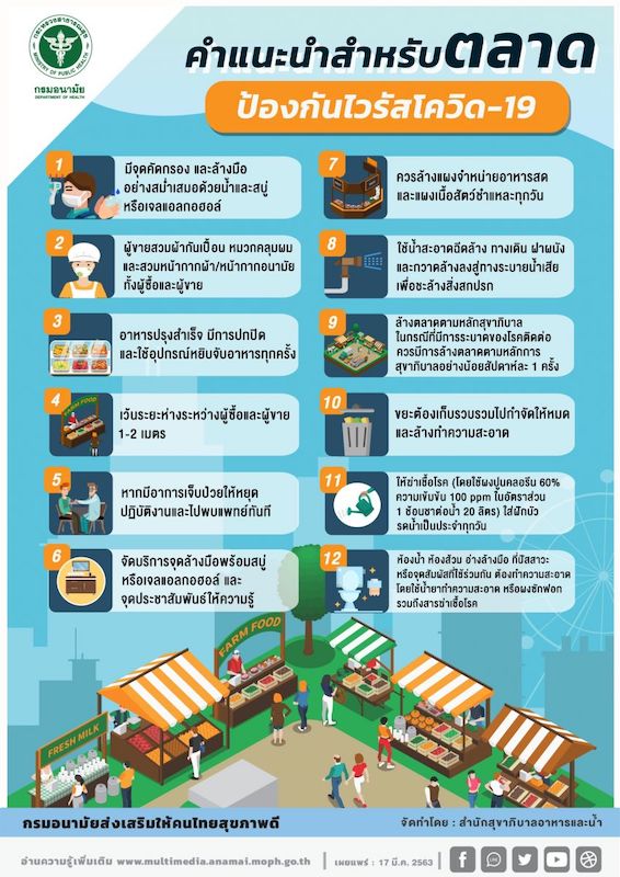 ส่วนข้อห่วงใยประชาชนกรณีมีรายงานข่าวผู้ติดเชื้อเป็นจำนวนมากในตลาดสดในกรุงปักกิ่ง ประเทศจีน กรมอนามัยได้มีคำแนะนำไปยังทุกตลาดสดให้ยึดปฏิบัติใน 12 มาตรการสำคัญ ประกอบด้วย 1.การคัดกรองผู้ใช้บริการ วัดไข้ ล้างมือ ลงทะเบียนก่อนเข้าตลาด 2.ผู้ขายสวมผ้ากันเปื้อนและหมวกคลุมผม และผู้ขาย/ผู้ซื้อต้องสวมหน้ากากผ้าหรือหน้ากากอนามัย 3.อาหารปรุงสำเร็จต้องมีการปกปิดและใช้อุปกรณ์หยิบจับ 4.เว้นระยะห่างระหว่างผู้ซื้อและผู้ขาย 1-2 เมตร 5.หากมีไข้ต้องหยุดปฏิบัติงานแล้วไปพบแพทย์ทันที 6.จัดจุดล้างมือในตลาดและจุดประชาสัมพันธ์อย่างทั่วถึง 7.ล้างแผงจำหน่ายอาหารสดและแผงเนื้อสัตว์ชำแหละทุกวัน 8.ฉีดน้ำล้างทางเดิน ทางระบายน้ำ เพื่อชำระล้างสิ่งสกปรก 9.ล้างตลาดสดตามหลักสุขาภิบาลอย่างน้อยสัปดาห์ละ 1 ครั้ง 10.กำจัดขยะอย่างถูกสุขลักษณะ 11.ฆ่าเชื้อโรคโดยใช้ผงปูนคลอรีน 60% เข้มข้น 100 ppm. ในอัตราส่วน 1 ช้อนชาต่อน้ำ 20 ลิตร ใส่ฝักบัวรดเป็นประจำ และ 12.ทำความสะอาดและฆ่าเชื้อห้องสุขาสาธารณะเป็นประจำ