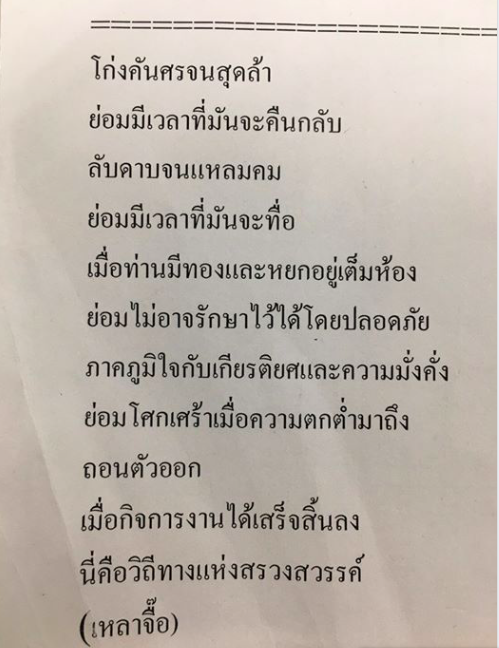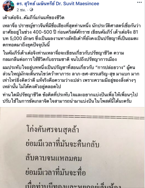 ผมประทับใจอยู่บทหนึ่งเป็นปรัญชาที่สอนเกี่ยวกับ “การปล่อยวาง” ผู้คนส่วนใหญ่มักจะดิ้นรนไขว่คว้าหาภาระ ลาภ-ยศ-สรรเสริญ-สุข มาแบก มากเท่าไหร่ยิ่งคิดว่าดี แท้จริงคือความว่างเปล่า เพราะความมีอยู่ของสิ่งต่างๆเหล่านั้น ไม่ได้คงตัวอยู่ตลอดไป