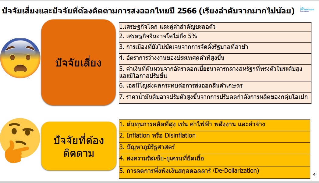 รวมถึงยังปัจจัยที่ยังต้องติดตามอย่างใกล้ชิด เพราะจะส่งผลกระทบต่อการส่งออกเช่นกัน ได้แก่ ต้นทุนการผลิตที่สูง เช่น ค่าไฟฟ้า พลังงาน และค่าจ้าง โดยไทยมีค่าไฟฟ้า ราคาน้ำมันดีเซล และค่าแรงสูงเป็นอันดับ3 ของอาเซียน, ค่าเงินบาทผันผวน, เงินเฟ้อสูงมีผลต่อกำลังซื้อ, ปัญหาภูมิรัฐศาสตร์ทั่วโลก โดยเฉพาะปัญหาสงครามรัสเซีย-ยูเครน  และการสิ้นสุดของข้อตกลงที่ให้ยูเครนส่งออกสินค้าผ่านทะเลดำได้ มีทั้งธัญพืช ปุ๋ยเคมี ซึ่งจะทำให้ราคาสินค้าดังกล่าวในตลาดโลกสูงขึ้น และมีผลต่อต้นทุนการผลิต รวมถึงการลดการพึ่งพิงเงินสกุลดอลลาร์สหรัฐฯ