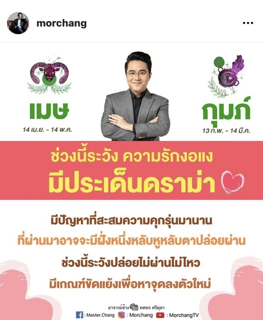 ผู้สื่อข่าวรายงานว่า “หมอช้าง” ทศพร ศรีตุลา หมอดูชื่อดัง ได้ข้อความผ่านช่องทางอินสตาแกรม (IG) : Morchang โดยมีเนื้อหาระบุว่า…