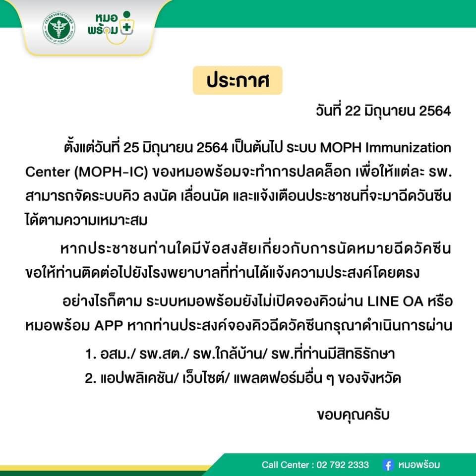 ตั้งแต่วันที่ 25 มิถุนายน 2564 เป็นต้นไป ระบบ MOPH Immunization Center (MOPH-IC) ของหมอพร้อมจะทำการปลดล็อก เพื่อให้แต่ละ รพ. สามารถจัดระบบคิว ลงนัด เลื่อนนัด และแจ้งเตือนประชาชนที่จะมาฉีดวัคซีนได้ตามความเหมาะสม