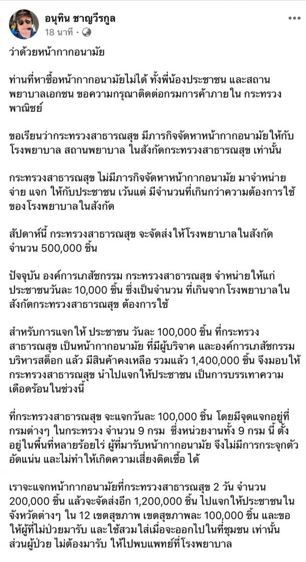 ผู้สื่อข่าวรายงานว่าเฟสบุ๊ค”อนุทิน ชาญวีรกูล”โพสต์ว่าด้วยหน้ากากอนามัย ท่านที่หาซื้อหน้ากากอนามัยไม่ได้ ทั้งพี่น้องประชาชน และสถานพยาบาลเอกชน ขอความกรุณาติดต่อกรมการค้าภายใน กระทรวงพาณิชย์