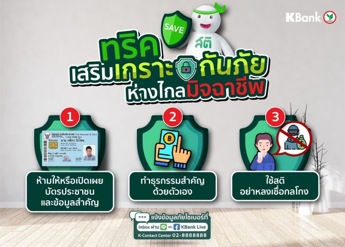 ผู้สื่อข่าวรายงานว่า วันนี้ (11 ต.ค.64) ธนาคารกสิกรไทย ได้ประกาศเตือนระวังแก๊งลวงกู้เงินออนไลน์ด้วยบัตรประชาชนใบเดียว จะสร้างหนี้ไม่รู้ตัว เนื่องจากในระยะนี้ มีกลุ่มมิจฉาชีพได้หลอกลวงประชาชนโดยการชักชวนให้กู้เงินหลักแสน ผ่านทางโทรศัพท์มือถือ โดยใช้บัตรประชาชนเพียงใบเดียว ซึ่งได้สร้างความเสียหายให้แก่ประชาชนในภาคตะวันออกและอาจจะขยายไปพื้นที่อื่นเพิ่มขึ้น