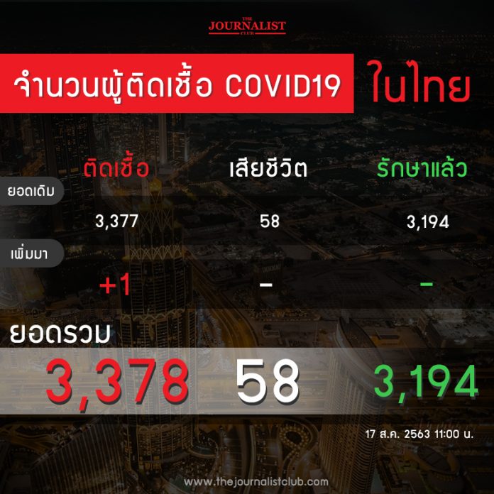 ผู้สื่อข่าวรายงานว่า เมื่อเวลา 11.30 น. วันนี้ ( 17 ส.ค.) ศูนย์บริหารสถานการณ์การแพร่ระบาดของโรคติดเชื้อไวรัส โคโรนา 2019 (ศบค.) ได้เผยแพร่ข้อมูลว่า วันนี้ประเทศไทย มีผู้ป่วยรายใหม่ 1 ราย กลับมาจากประเทศอินโดนีเซีย ทำให้ยอดผู้ป่วยสะสมอยู่ที่ 3,378 คน เสียชีวิตคงที่ 58 คน รักษาหายแล้ว 3,194คน
