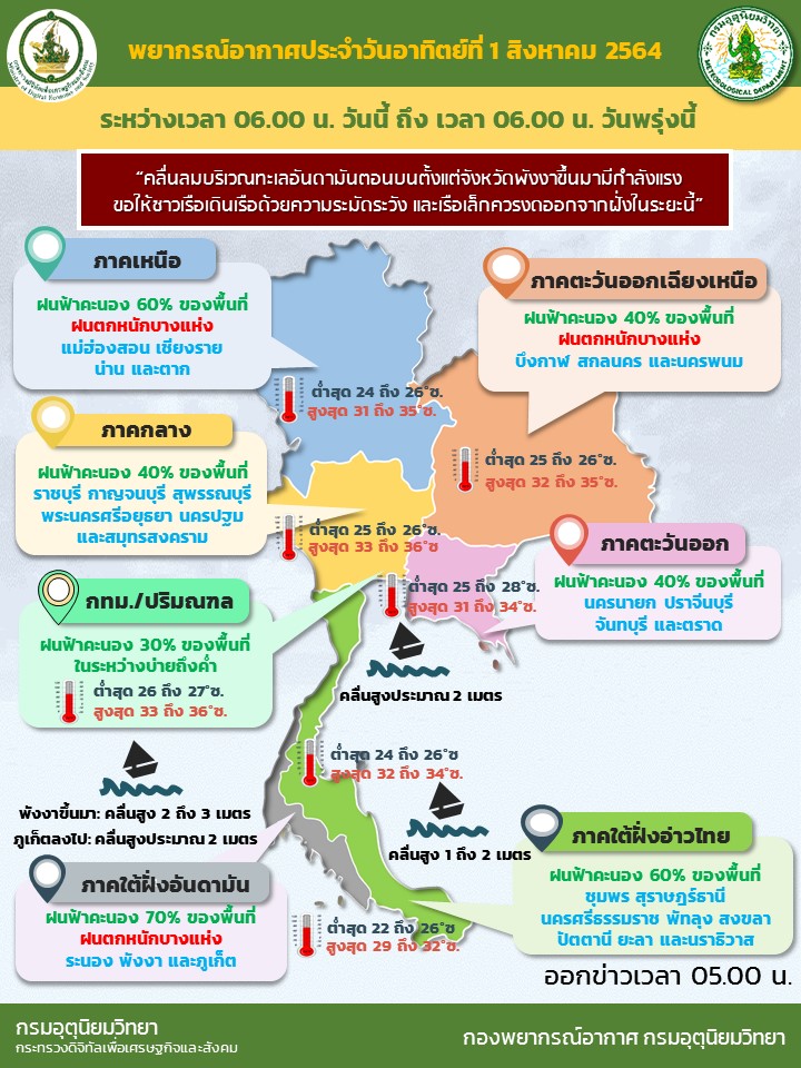 วันที่ 1 ส.ค.64 กรมอุตุนิยมวิทยา พยากรณ์อากาศ 24 ชั่วโมงข้างหน้า มรสุมตะวันตกเฉียงใต้ที่พัดปกคลุมทะเลอันดามัน ประเทศไทย และอ่าวไทย ยังคงมีกำลังค่อนข้างแรง ประกอบกับมีหย่อมความกดอากาศต่ำ ปกคลุมบริเวณประเทศเวียดนามตอนบน ลักษณะเช่นนี้ทำให้ภาคเหนือ ภาคตะวันออกเฉียงเหนือ และภาคใต้ฝั่งตะวันตก มีฝนตกหนักบางแห่ง ขอให้ประชาชนบริเวณดังกล่าว ระวังอันตรายจากฝนตกหนักและฝนที่ตกสะสม ซึ่งอาจทำให้เกิดน้ำท่วมฉับพลัน และน้ำป่าไหลหลากได้