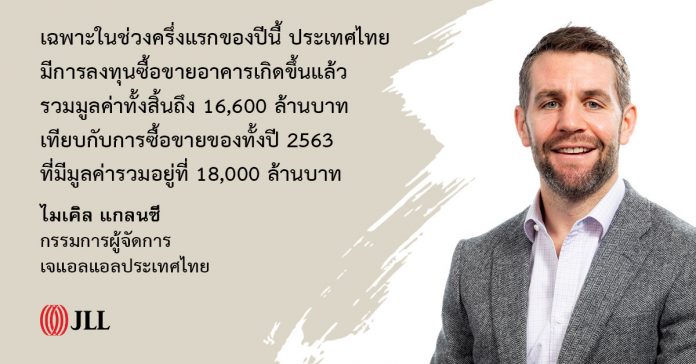 “ในประเทศไทย การลงทุนซื้อขายอาคารในช่วงครึ่งแรกของปีนี้ มีมูลค่ารวมทั้งสิ้น 16,600 ล้านบาท เพิ่มขึ้น 20.5% จากครึ่งแรกของปี 2563” นายเรจินา ลิม กล่าว