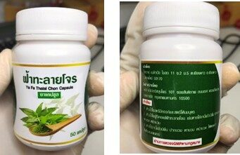 5.ยาแคปซูลฟ้าทะลายโจรสกัด (ANDROGRAPHIS EXTRACT CAPSULES) ฉลากระบุทะเบียนเลขที่ G1/61 (พจ) และระบุชื่อผู้จำหน่าย สี่พระยาโอสถ วัดโพธิ์ แขวงพระราชวัง เขตพระนคร กรุงเทพมหานคร ไม่ระบุชื่อผู้ผลิต ตรวจสอบแล้วพบว่า ผลิตภัณฑ์ดังกล่าวสวมเลขทะเบียนตำรับสมุนไพรของห้างหุ้นส่วนจำกัด เจ้าพระยาโอสถ ซึ่งตั้งอยู่ที่จังหวัดพิจิตร
