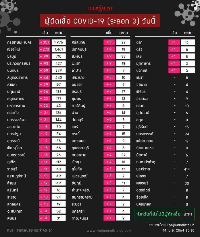 ผู้สื่อข่าวรายงานว่า สำหรับสถานการณ์โควิด-19 ประจำวันที่ 14 เม.ย.2564 สรุปภาพรวมผู้ติดเชื้อใหม่ได้ จำนวน 57 จังหวัด ดังนี้
