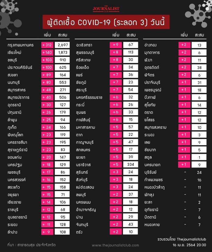 ผู้สื่อข่าวรายงานว่า สำหรับสถานการณ์โควิด-19 ประจำวันที่ 16 เม.ย.2564 สรุปภาพรวมผู้ติดเชื้อใหม่ได้ จำนวน 69 จังหวัด ดังนี้